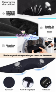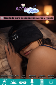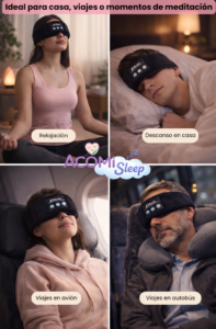 Acomi Sleep combina bloqueo total de luz con audio relajante integrado, creando un entorno ideal para descansar profundamente.